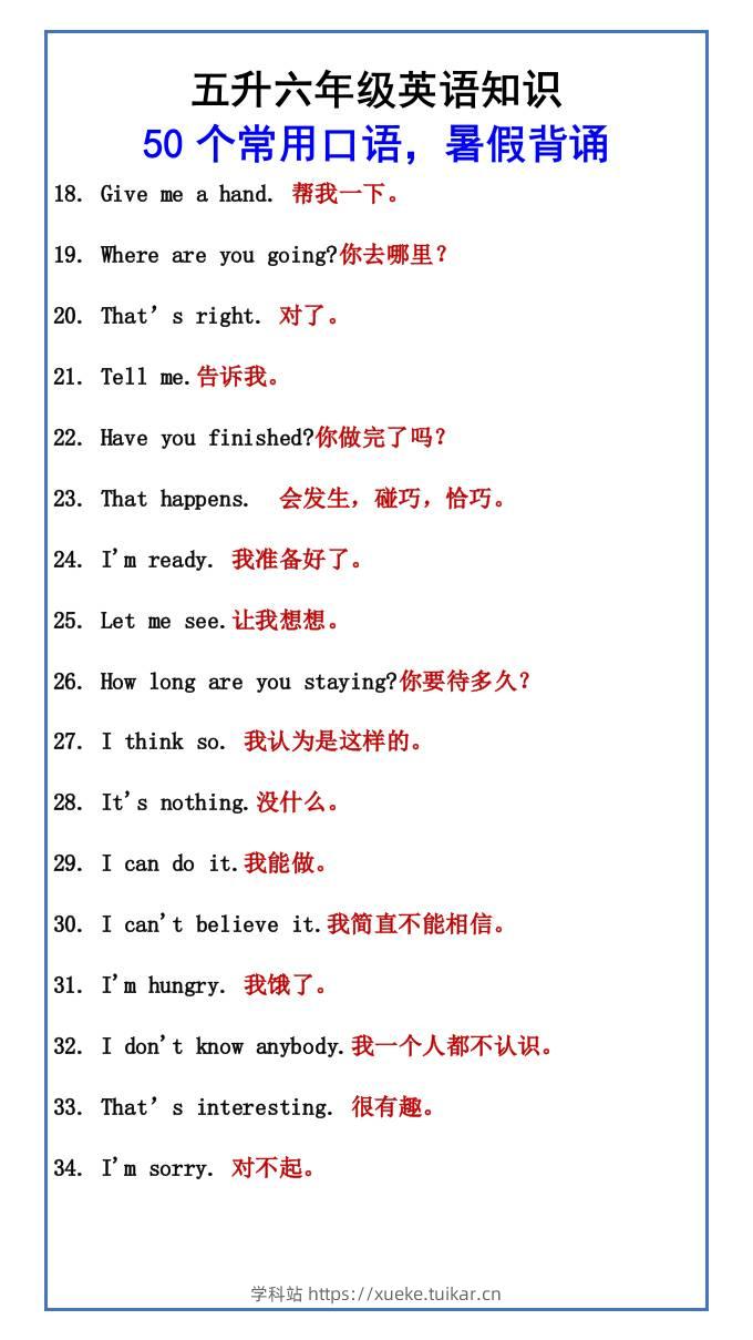 五升六年级英语知识50个常用口语,暑假背诵-六上英语admin7月6日发布关注私信0476五升六年级英语知识50个常用口语,暑假背诵-六上英语此内容为付费资源,请付费后查看会员专属资源黄金会员免费您暂无购买权限,请先开通会员开通会员格式docx页数3 页大小64.90 KB付费资源 ——预览已结束,还剩1页未读——开通会员后可免费下载高清完整文档 © 版权声明文章版权归作者所有,未经允许请勿转载。THE END小学英语 喜欢就支持一下吧点赞6 分享QQ空间微博QQ好友海报分享复制链接收藏