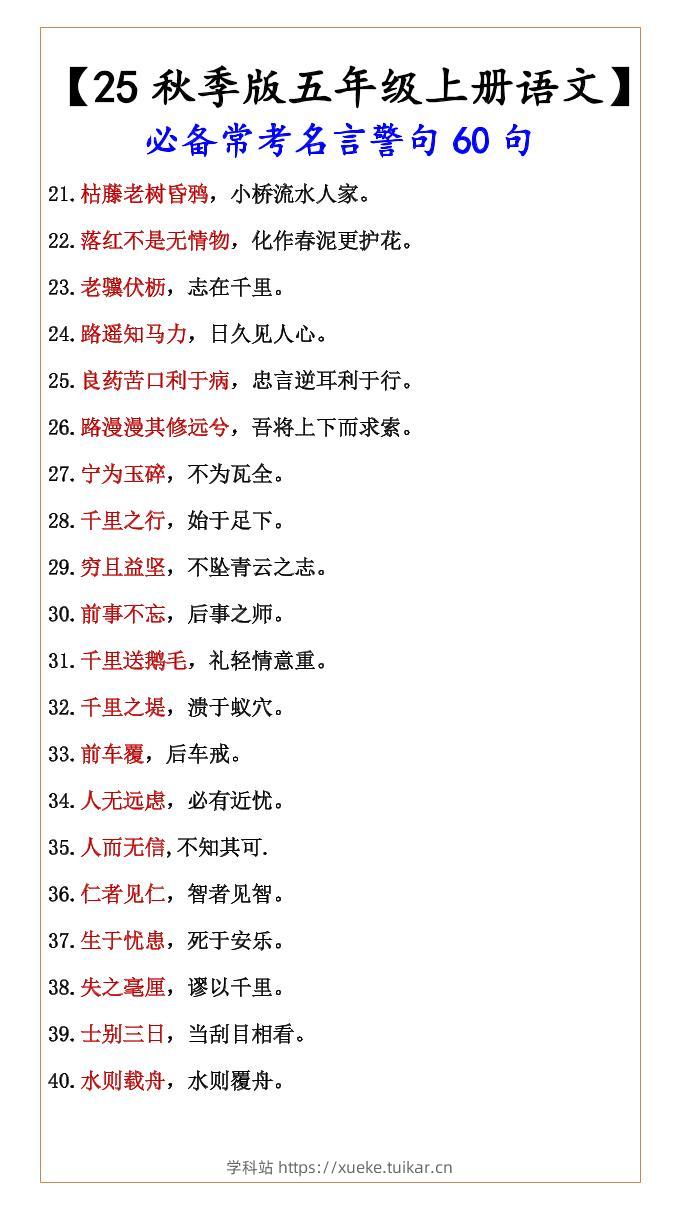 【2025秋新版】【五年级上册语文】必备常考名言警句60句admin7月26日发布关注私信0328【2025秋新版】【五年级上册语文】必备常考名言警句60句此内容为付费资源,请付费后查看会员专属资源黄金会员免费您暂无购买权限,请先开通会员开通会员格式pdf页数3 页大小82.97 KB付费资源 ——预览已结束,还剩1页未读——开通会员后可免费下载高清完整文档 © 版权声明文章版权归作者所有,未经允许请勿转载。THE END小学语文 喜欢就支持一下吧点赞8 分享QQ空间微博QQ好友海报分享复制链接收藏
