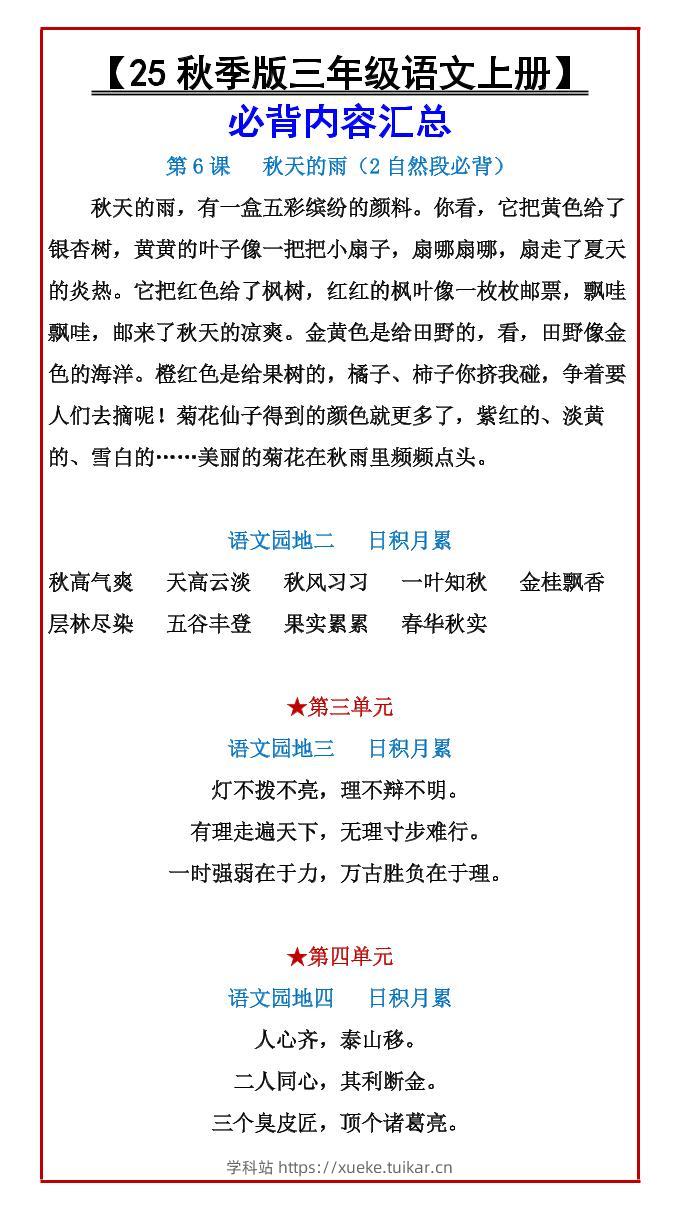 【2025秋新版】【三年级语文上册】必背内容汇总admin7月28日发布关注私信02114【2025秋新版】【三年级语文上册】必背内容汇总此内容为付费资源,请付费后查看会员专属资源黄金会员免费您暂无购买权限,请先开通会员开通会员格式pdf页数5 页大小123.02 KB付费资源 ——预览已结束,还剩3页未读——开通会员后可免费下载高清完整文档 © 版权声明文章版权归作者所有,未经允许请勿转载。THE END小学语文 喜欢就支持一下吧点赞14 分享QQ空间微博QQ好友海报分享复制链接收藏