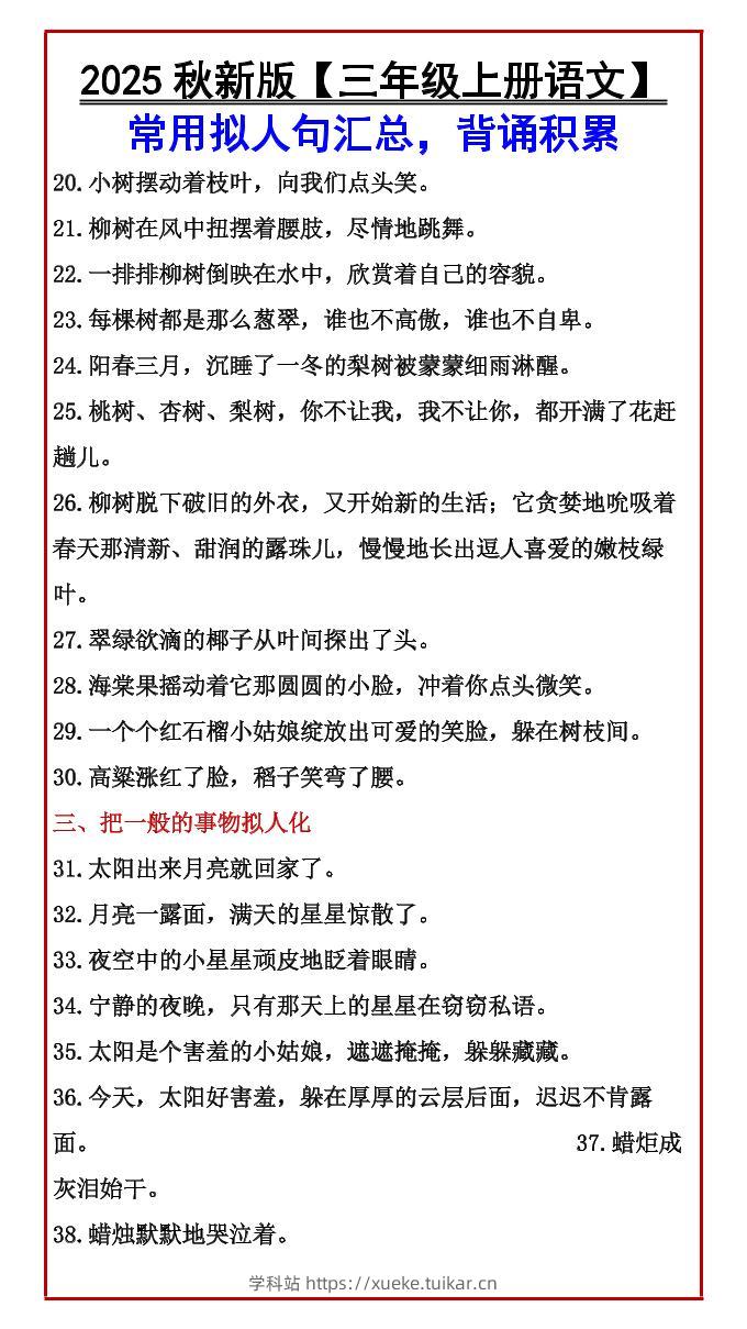【2025秋新版】【三年级上册语文】常用拟人句汇总,背诵积累admin7月31日发布关注私信0465【2025秋新版】【三年级上册语文】常用拟人句汇总,背诵积累此内容为付费资源,请付费后查看会员专属资源黄金会员免费您暂无购买权限,请先开通会员开通会员格式pdf页数3 页大小111.93 KB付费资源 ——预览已结束,还剩1页未读——开通会员后可免费下载高清完整文档 © 版权声明文章版权归作者所有,未经允许请勿转载。THE END小学语文 喜欢就支持一下吧点赞5 分享QQ空间微博QQ好友海报分享复制链接收藏