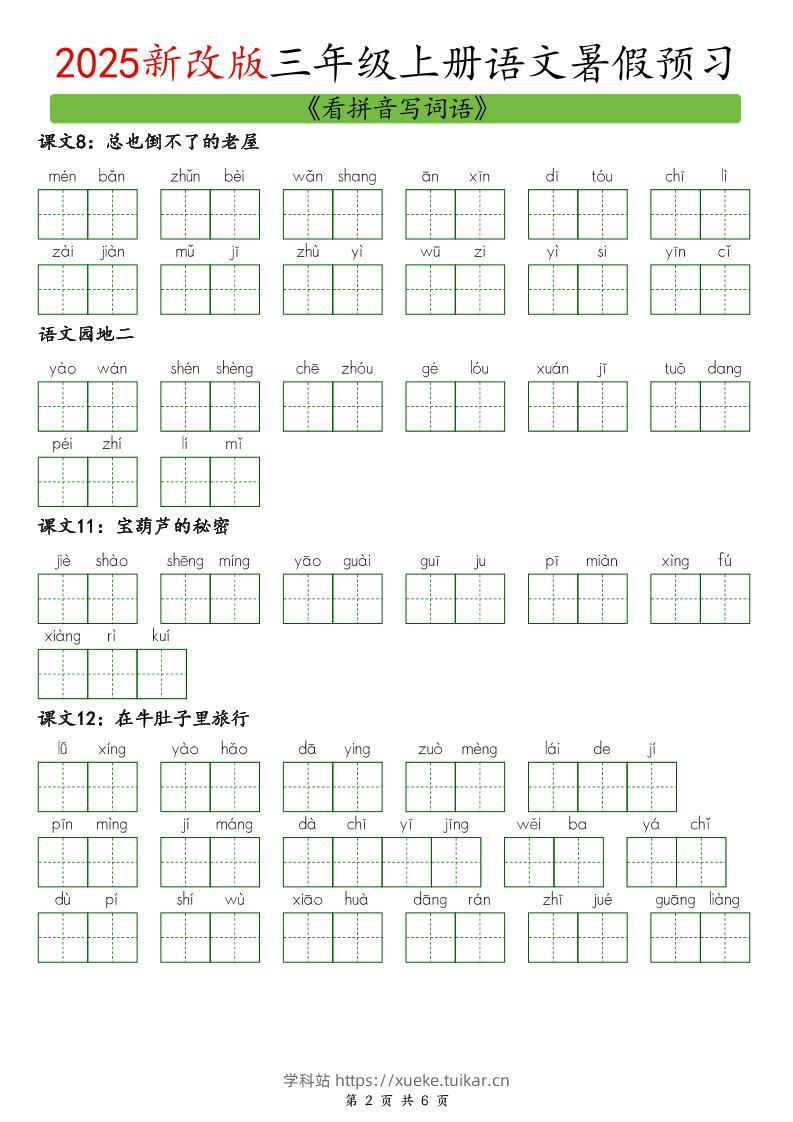 2025新版三上语文暑假预习看拼音写词语admin9月15日发布关注私信05182025新版三上语文暑假预习看拼音写词语此内容为付费资源,请付费后查看会员专属资源黄金会员免费您暂无购买权限,请先开通会员开通会员格式pdf页数6 页大小96.14 KB付费资源 ——预览已结束,还剩4页未读——开通会员后可免费下载高清完整文档 © 版权声明文章版权归作者所有,未经允许请勿转载。THE END小学语文 喜欢就支持一下吧点赞8 分享QQ空间微博QQ好友海报分享复制链接收藏