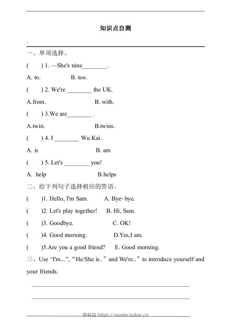 三上英语-Unit1Let’sbefriends!知识总结+练习(含答案)admin9月19日发布关注私信04811三上英语-Unit1Let’sbefriends!知识总结+练习(含答案)此内容为付费资源,请付费后查看会员专属资源黄金会员免费您暂无购买权限,请先开通会员开通会员格式doc页数3 页大小26.50 KB付费资源 ——预览已结束,还剩1页未读——开通会员后可免费下载高清完整文档 © 版权声明文章版权归作者所有,未经允许请勿转载。THE END小学英语 喜欢就支持一下吧点赞11 分享QQ空间微博QQ好友海报分享复制链接收藏