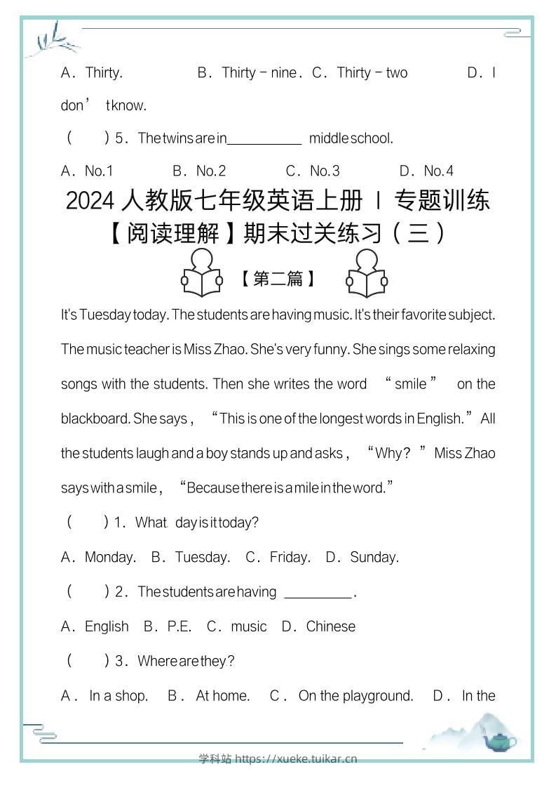 【2025秋新版】七年级英语上册:阅读理解期末复习过关练习(5篇)admin10月13日发布关注私信0428【2025秋新版】七年级英语上册:阅读理解期末复习过关练习(5篇)此内容为付费资源,请付费后查看会员专属资源黄金会员免费您暂无购买权限,请先开通会员开通会员格式pdf页数11 页大小82.52 KB付费资源 ——预览已结束,还剩9页未读——开通会员后可免费下载高清完整文档 © 版权声明文章版权归作者所有,未经允许请勿转载。THE END初中英语 喜欢就支持一下吧点赞8 分享QQ空间微博QQ好友海报分享复制链接收藏